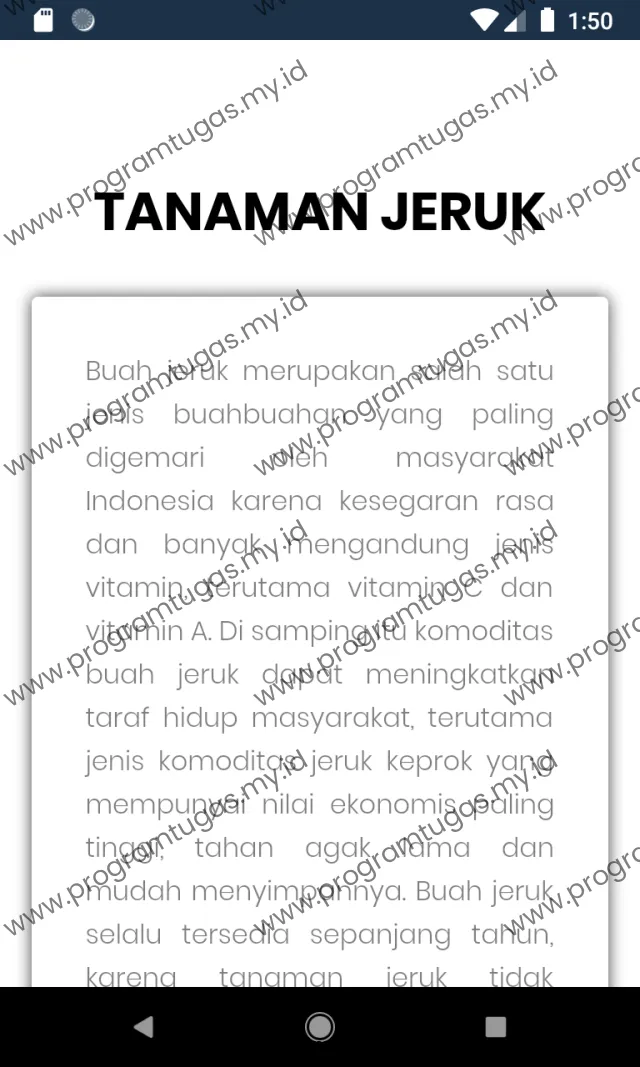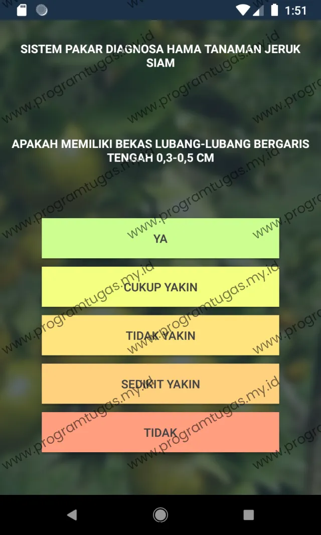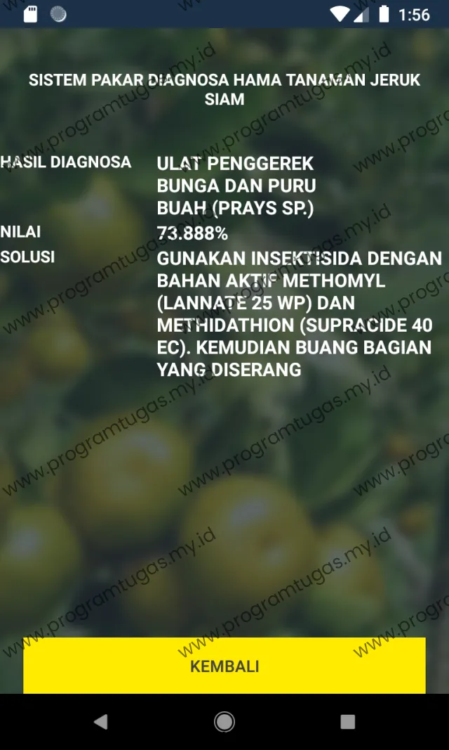 Aplikasi sistem pakar diagnosa hama pada tanaman jeruk ini terdiri dari tampilan menu utama, tanaman jeruk, diagnosa dan profil pembuat. Pengguna hanya tinggal menjawab pertanyaan yang diberikan aplikasi untuk dapat mendapatkan hasil persentase yang diberikan oleh aplikasi